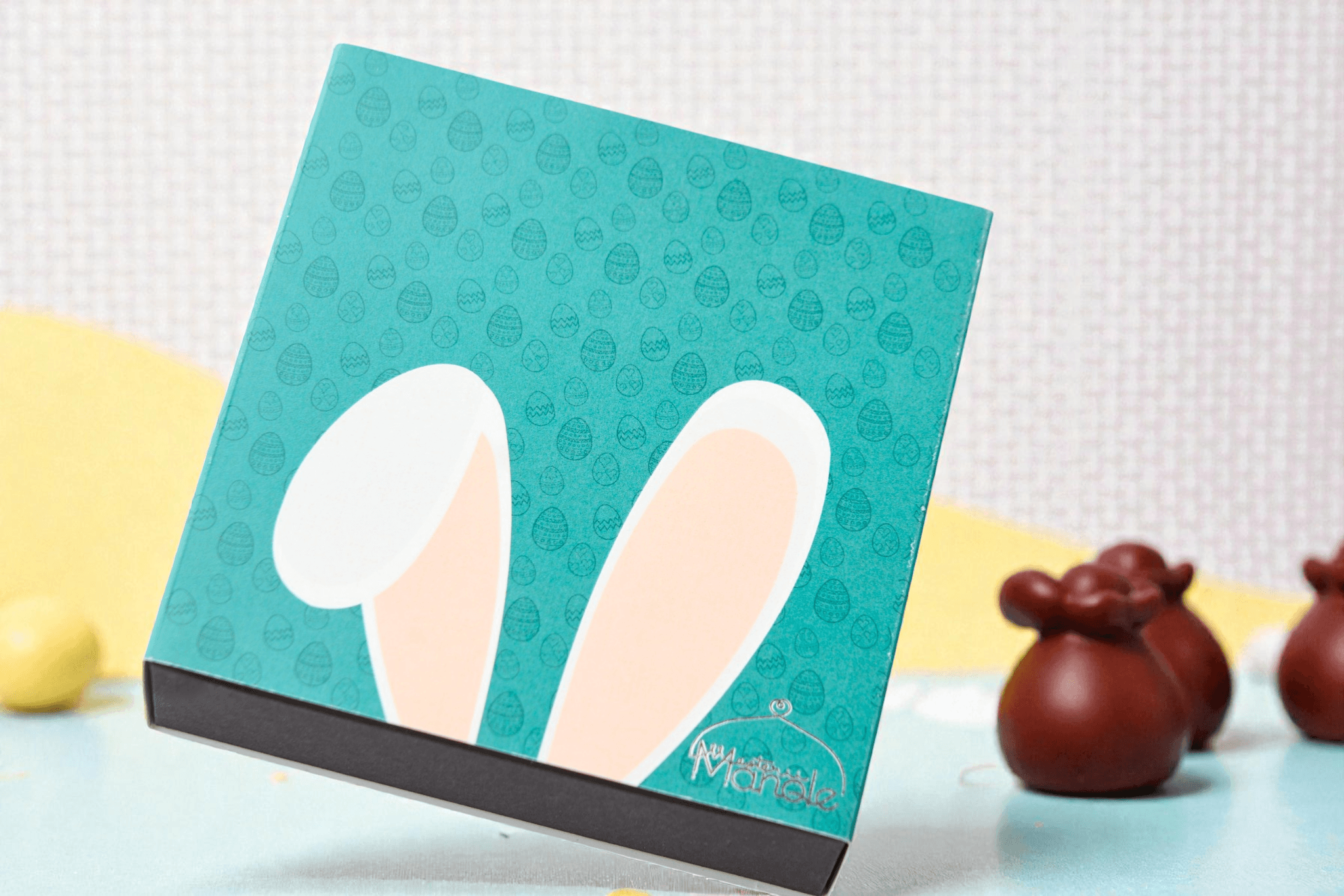 Cutie cu 9 praline sub formă de ouă turtite, decorate cu transfer.